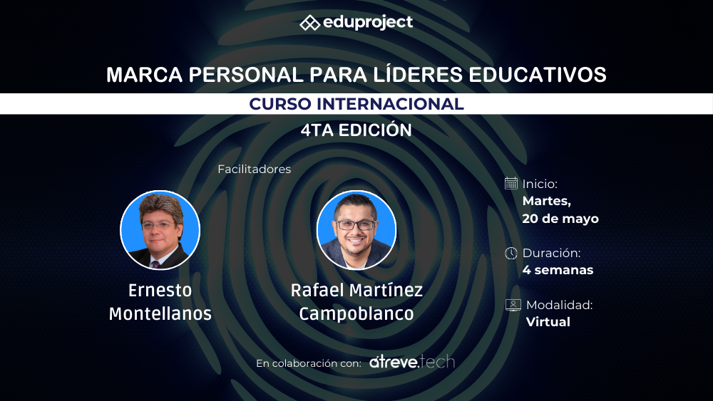 Nos complace invitarlos a postularse para la Cuarta Edición del curso sobre "Marca personal para líderes educativos" que comenzará este martes 20 de mayo de 2025 y tendrá una duración de cuatro semanas. Este curso es completamente virtual y gratuito (previa postulación) y está organizado por Grupo Eduproject en colaboración con atreve.tech y Acreditta.