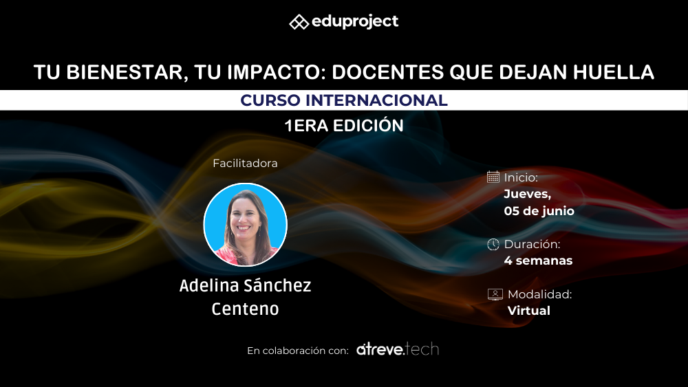 Nos complace invitarlos a postularse para la Primera Edición del curso sobre "Tu bienestar, tu impacto: Docentes que dejan huella" que comenzará este jueves 5 de junio de 2025 y tendrá una duración de cuatro semanas. Este curso es completamente virtual y gratuito (previa postulación) y está organizado por Grupo Eduproject en colaboración con atreve.tech y Acreditta.