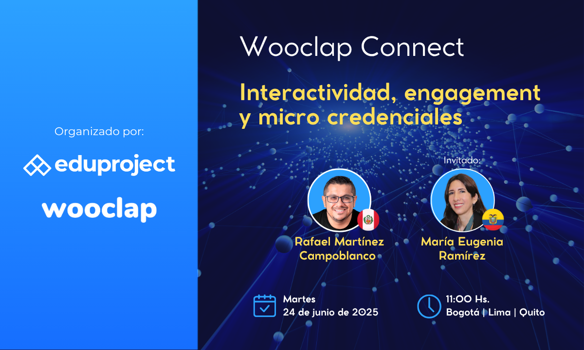 Nos complace invitarlos al webinar titulado "Interactividad, engagement y micro credenciales", con nuestro invitado especial María Eugenia Ramírez (Ecuador), el próximo martes 24 de junio a las 11:00 horas (Bogotá | Lima | Quito). Es un evento organizado por Grupo Eduproject para promover la adopción estratégica de tecnologías interactivas mediante la difusión de experiencias reales y casos de éxito de Wooclap a nivel internacional
