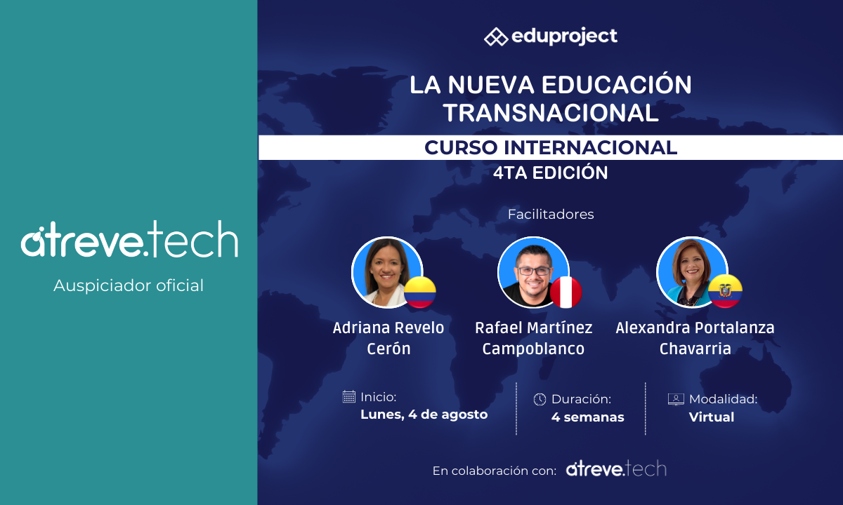 Nos complace invitarlos a postularse para la Cuarta Edición del curso sobre "La nueva educación transnacional" que comenzará el próximo lunes 4 de agosto de 2025 y tendrá una duración de cuatro semanas. Este curso es completamente virtual y gratuito (previa postulación) y está organizado por Grupo Eduproject en colaboración con atreve.tech y Acreditta.