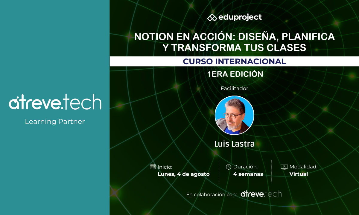 Nos complace invitarlos a postularse para la Primera Edición del curso sobre "Notion en acción: Diseña, planifica y transforma tus clases" que comenzará el próximo lunes 4 de agosto de 2025 y tendrá una duración de cuatro semanas. Este curso es completamente virtual y gratuito (previa postulación) y está organizado por Grupo Eduproject en colaboración con atreve.tech y Acreditta.